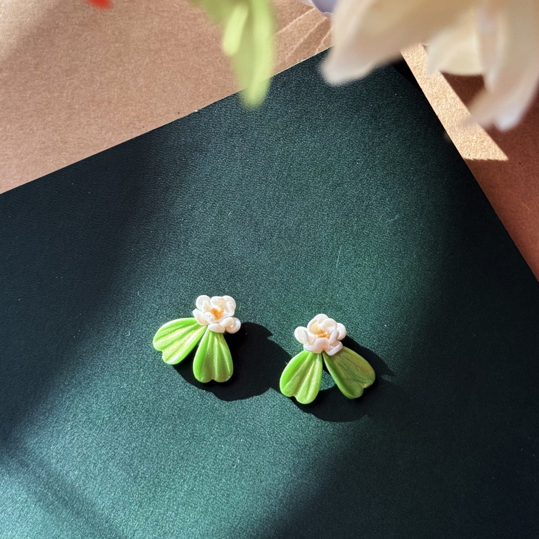 Hand-sculpted white blossoms with pearl-sheen petals, golden centers, and soft green leaves. The light clay coating preserves the natural texture, giving each handmade piece a fresh and elegant look. Set on 14K gold-filled posts, safe for sensitive ears.